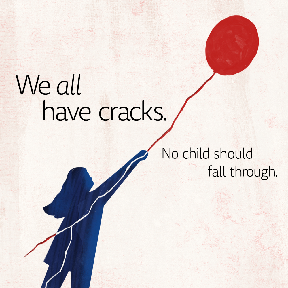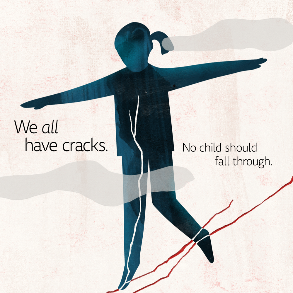 In the social images, one child walks gingerly on a tightrope, one gently blows dandelion seeds, and another holds a balloon slightly askew. The images ask viewers to look closer at the youth around them, demonstrating that even in play and child-like activities, vulnerabilities can be present and just out of view.