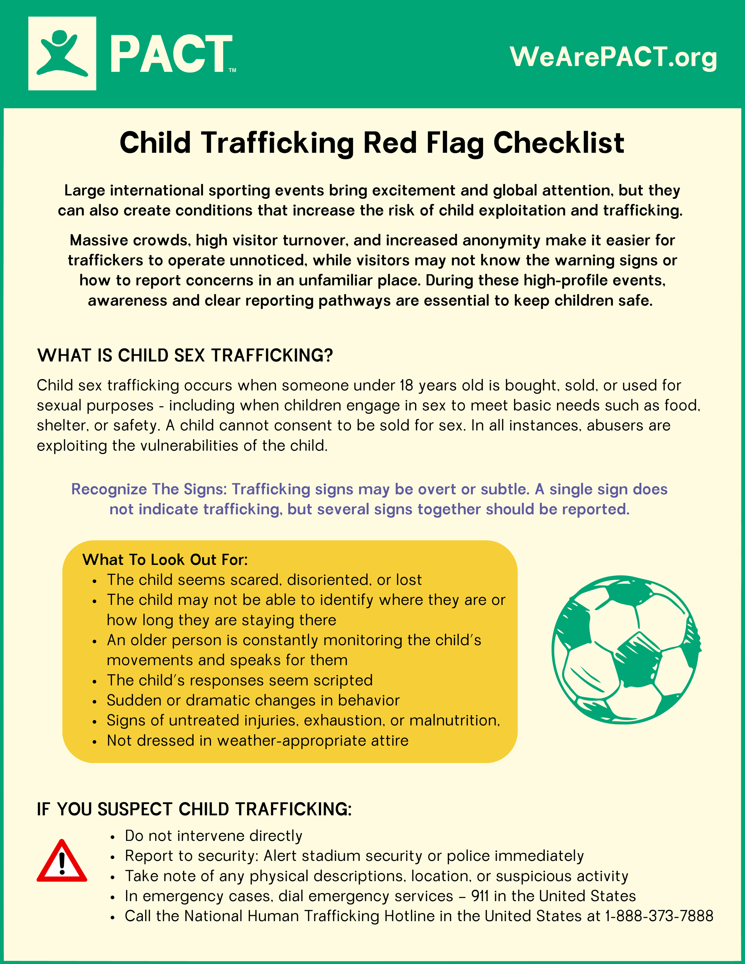 As the United States prepares to host the FIFA World Cup, millions of fans, tourists, workers, and local residents will come together across multiple cities. While mega sporting events bring celebration, economic activity, and global attention, they also create conditions that sex traffickers exploit. PACT is committed to prevention, awareness, and coordinated action to protect children and adolescents from sexual exploitation and trafficking in the lead-up to and during the 2026 World Cup.